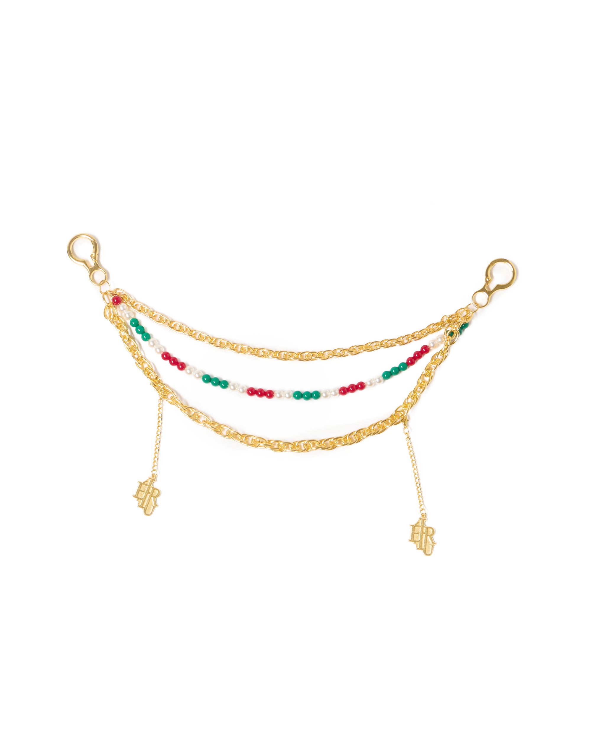 The Ehrù Studios Triple-Layer Wallet Chain adds a refined statement to everyday styling. Designed with layered gold-tone chains and a beaded center strand, it’s finished with signature Ehrù charms for a bold yet polished look.